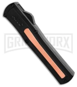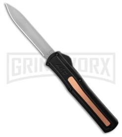 This model has a black aluminum handle with copper accents and a spear point blade.