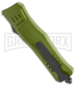 This large Atomic Dagger OTF model has a OD green handle and a black and two tone finished drop point with a serrated edge.