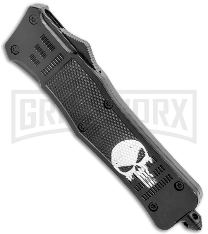 The Atomic OTF offers a rugged design with solid EDC construction. This model has a stainless steel two-tone dagger blade with a serrated edge. The handle has a rubberized texture for improved grip and a Punisher Skull accent with a pocket clip for carrying comfort. Using the side mounted slide button will activate the double-action automatic feature for lightning fast blade deployment. A pommel glass breaker finishes off the tactical design.
