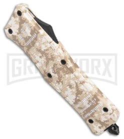 This Atomic OTF model has a tan digi camo handle and a brown and satin finished drop point blade with a plain edge.