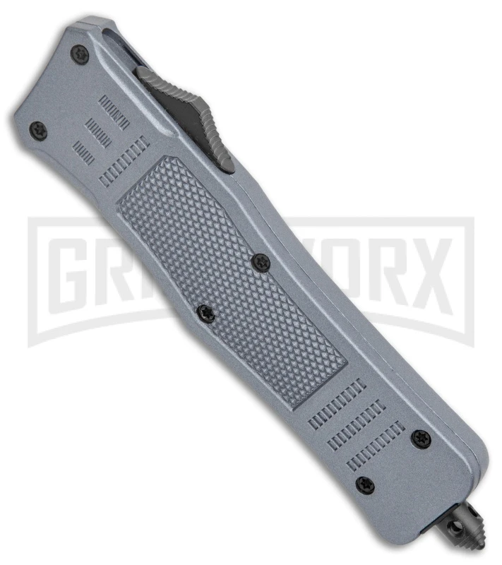 The Atomic Defender OTF Knife model has a gray handle and a two-tone clip point blade with a plain edge. It features a rugged design with solid EDC construction. The handle is textured for improved grip with a pocket clip for tip-down carrying comfort. Using the side mounted slide button activates the double-action, automatic feature, for lightning fast blade deployment. A pommel glass breaker finishes off the tactical design. It also comes with a Velcro, nylon carrying case.
