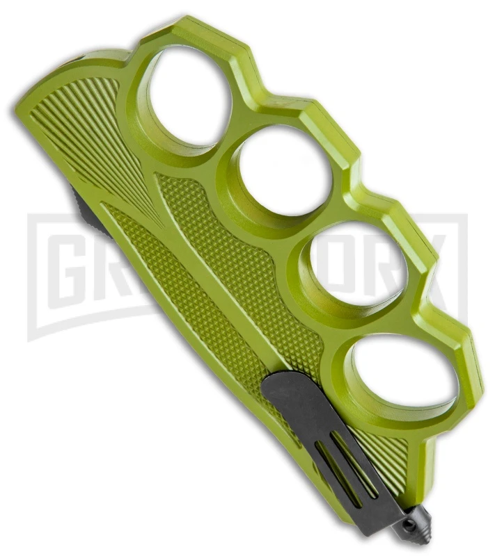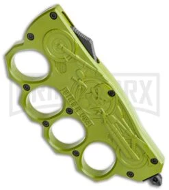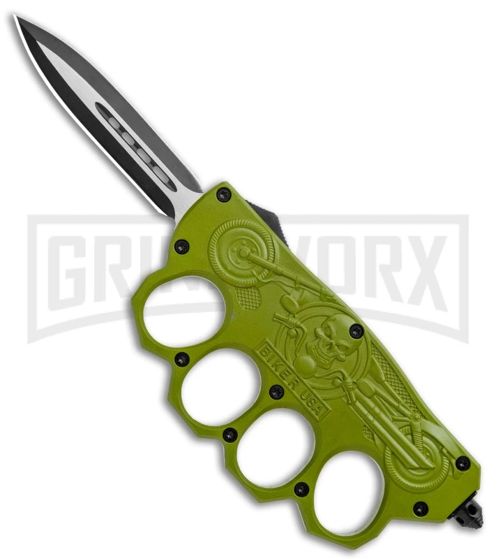 This knuckle OTF knife has a detailed biker relief. It features a green knuckle handle with 4 finger holes, and a two-tone finished dagger blade. Item includes a stainless steel glass breaker and tip-up pocket clip. The handle has a molded biker symbol. A double action thumb-slide offers rapid one-hand automatic opening action! Get it only at Grindworx!