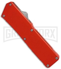 This Lightning OTF model has a double edge dagger blade with a black finish. The red coated aluminum handle provides a textured surface to facilitate a secure grip. Its firing button is mounted on the side, making the Lightning slim and easy to carry. The blade is made from satin finished stainless steel.