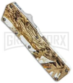 This Lightning model is outfitted with a tree camo finished handle and a satin finished drop point blade with a plain edge.