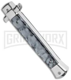 This Mago OTF model features a satin finished bayonet blade and a silver aluminum handle with black marbled acrylic scales.