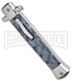 This Mago OTF model features a satin finished bayonet blade and a silver aluminum handle with silver bolsters and “Black Smoke Abysss” acrylic scales.