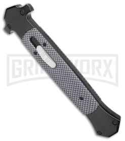 This is another awesome stainless steel stiletto OTF inspired by the classic Italian stilettos. It’s a massive 13″ when open and the acrylic handle is a very cool-looking silver with dark horn inlays. The knife fires automatically with a thumb slide deployment and retracting mechanisms.