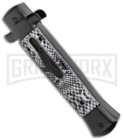 This Mago OTF model features a satin finished bayonet blade and a black, acrylic “Cottonmouth” handle.