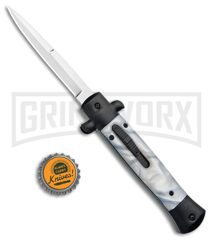 This Mago OTF model features a satin finished bayonet blade and an acrylic white marble handle with black bolsters.