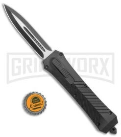 This Rumble model has a textured black finished body. The stainless steel dagger blade on this knife is two-tone black finished with a plain edge. The Rumble is a double-action OTF knife with performance you’re sure to enjoy. This automatic knife fires open and closed with the slide of the firing button. Item includes a glass breaker tip and a tip-down carry pocket clip.
