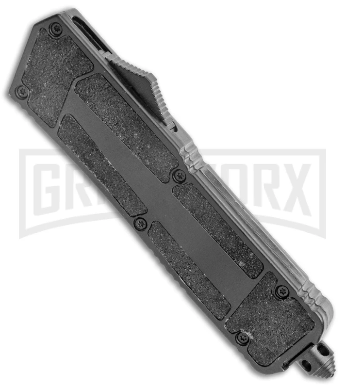 This Rumble Heavy Duty OTF automatic model has a serrated drop point style blade with a two-tone black and satin finish. The handle is made from black-coated aluminum .