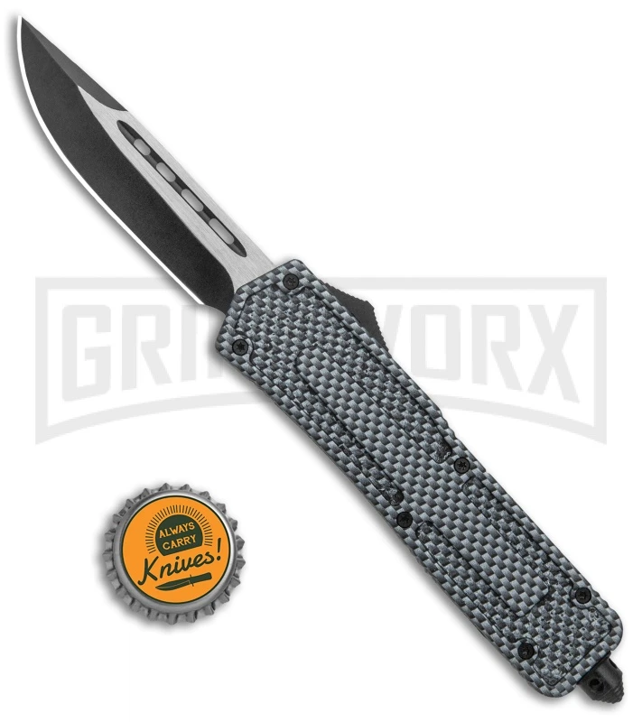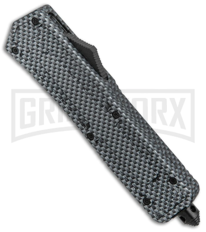 This Rumble model has a simulated carbon fiber body with coarse. The stainless steel drop point blade on this knife is two-tone black finished with a single edge. The Rumble is a double-action OTF knife with performance you’re sure to enjoy. This automatic knife fires open and closed with the slide of the firing value. Item includes a glass breaker tip and a tip-down carry pocket clip.