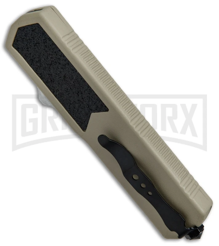 The Titan OTF knife represents a great balance of functionality, usability and value. It has a desert tan coated handle with grip inserts, ensuring slip-resistance. The partially serrated, double-edge dagger blade is stainless steel and has a satin finish. The firing button is mounted on the side, making the Titan slim and unobtrusive. The pocket clip is mounted on the back and fastened with a glass breaker tip.